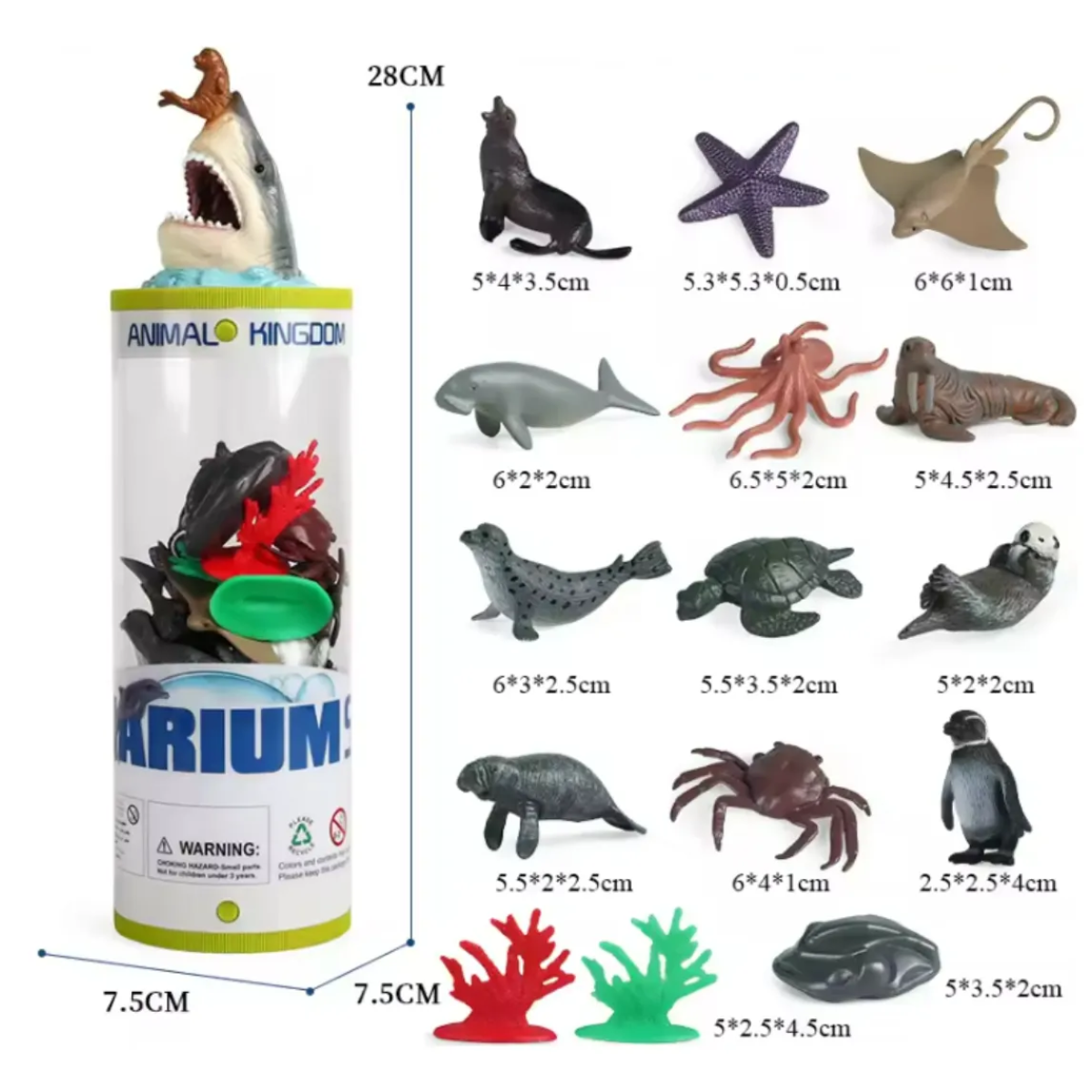 Descubre el mundo marino con este set de figuras educativas y divertidas. Incluye una variedad de animales como tiburón, mantarraya, tortuga, foca, pingüino, pulpo, delfín, estrella de mar, cangrejo, morsa, leones marinos, corales y más (el contenido puede variar).